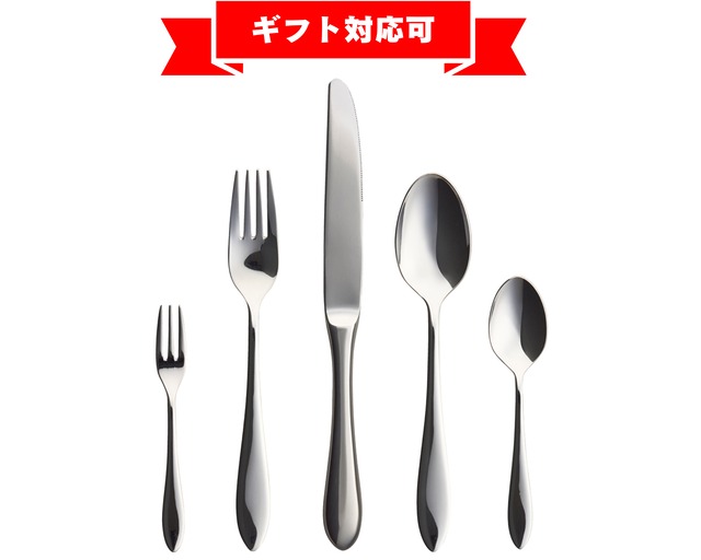 新居祝い、結婚祝い、転居祝いに。 アクセサリーのように輝くカトラリーで食卓を彩ってほしい。 ナイフも入った本格カトラリーセットです。 ご家庭の食卓でプロのコーディネートを再現できます。 ◆デザイン「ジィーン」の特徴◆ ・女性人気No.1デザイン ハンドルが”うさぎの耳”のようなかわいく、柔らかいシルエット ・2010年発売からウェディング会場・ギフトで大活躍 ハンドルのまるみ、壺型のベッドが印象的 ・カジュアルにも、クラッシックにも対応できるデザイン 無地でコーディネートしやすい計算された形状 ◆セット内容◆ ・デザートナイフ ×1 全長約232mm ・デザートスプーン ×1 全長約186mm ・デザートフォーク ×1 全長約188mm ・ティースプーン ×1 全長約138mm ・ヒメフォーク ×1 全長約121mm