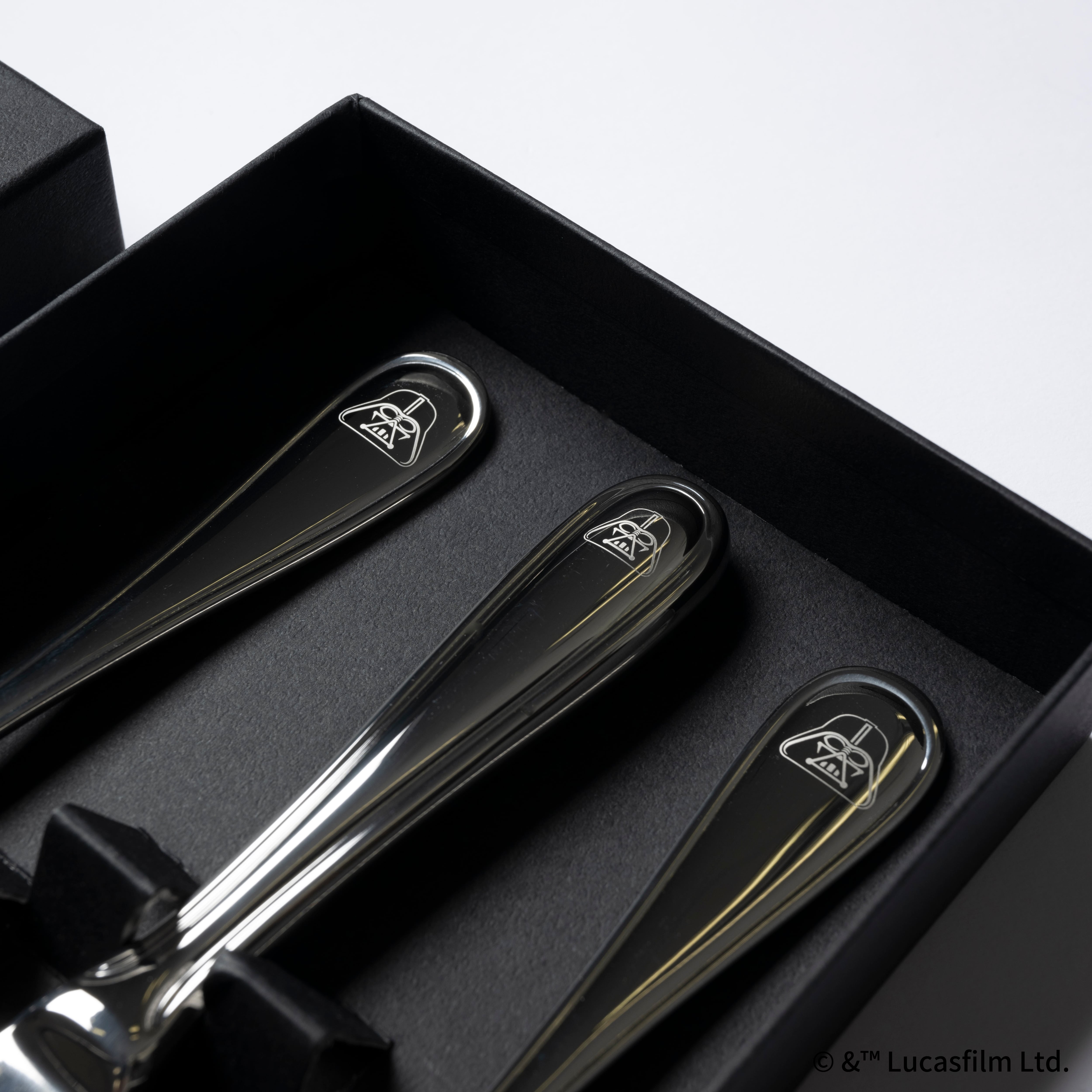 「ダース・ベイダー」がレーザー刻印されたナイフ、フォーク、スプーン各1本に、「ダース・ベイダー」をイメージした黒いギフト箱が付いたカトラリーセットです。