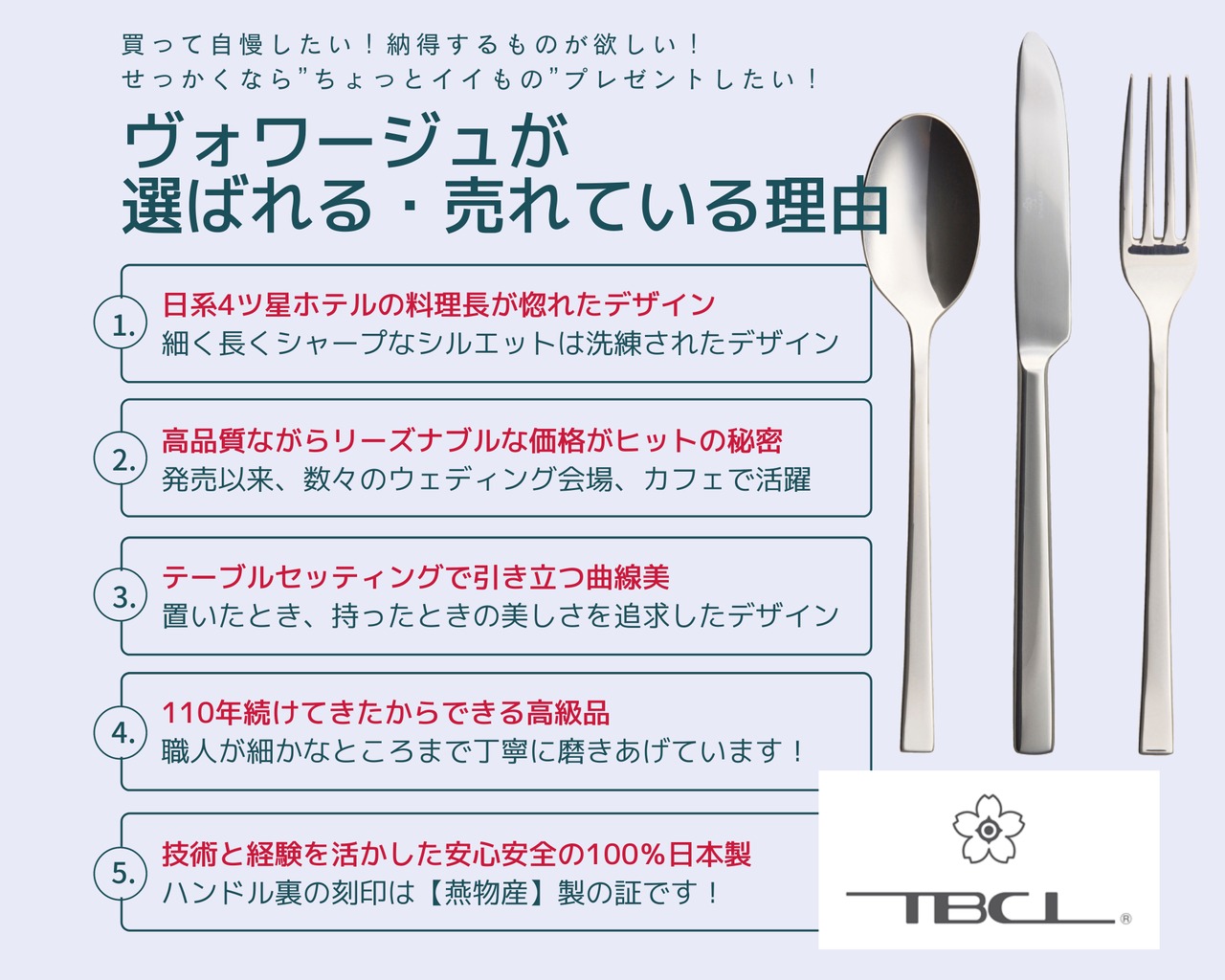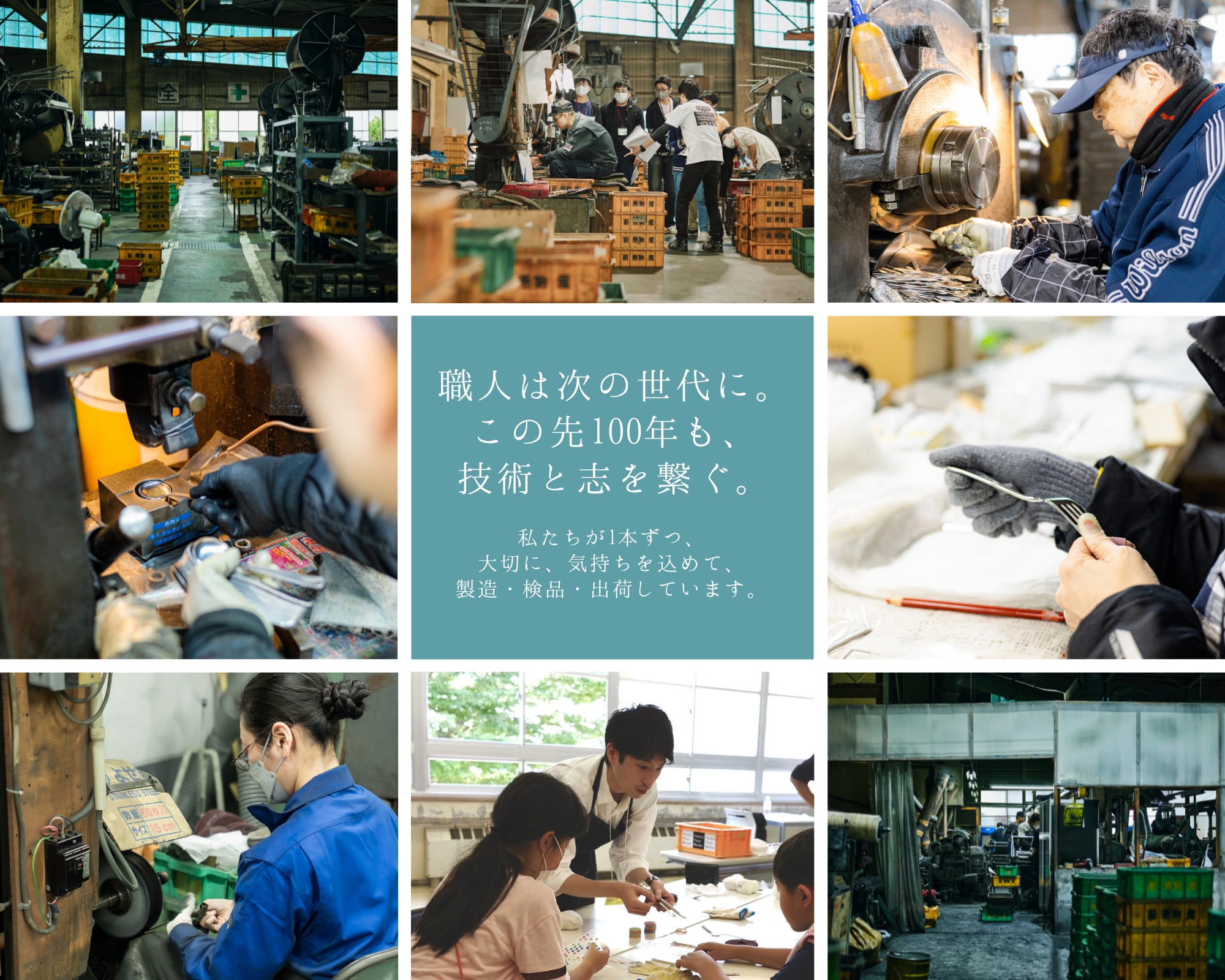 新潟県燕市は金属洋食器の産地として発展してきた地域であり、燕物産はそこで培われた技術を受け継ぎながらカトラリーを製造しています。職人の手で一つひとつ磨き上げることで、持ったときのなめらかな手触りと、美しいミラーの輝きを実現しています。毎日の食卓から特別な日のテーブルコーディネートまで、安心してお使いいただける品質を大切にしています。
